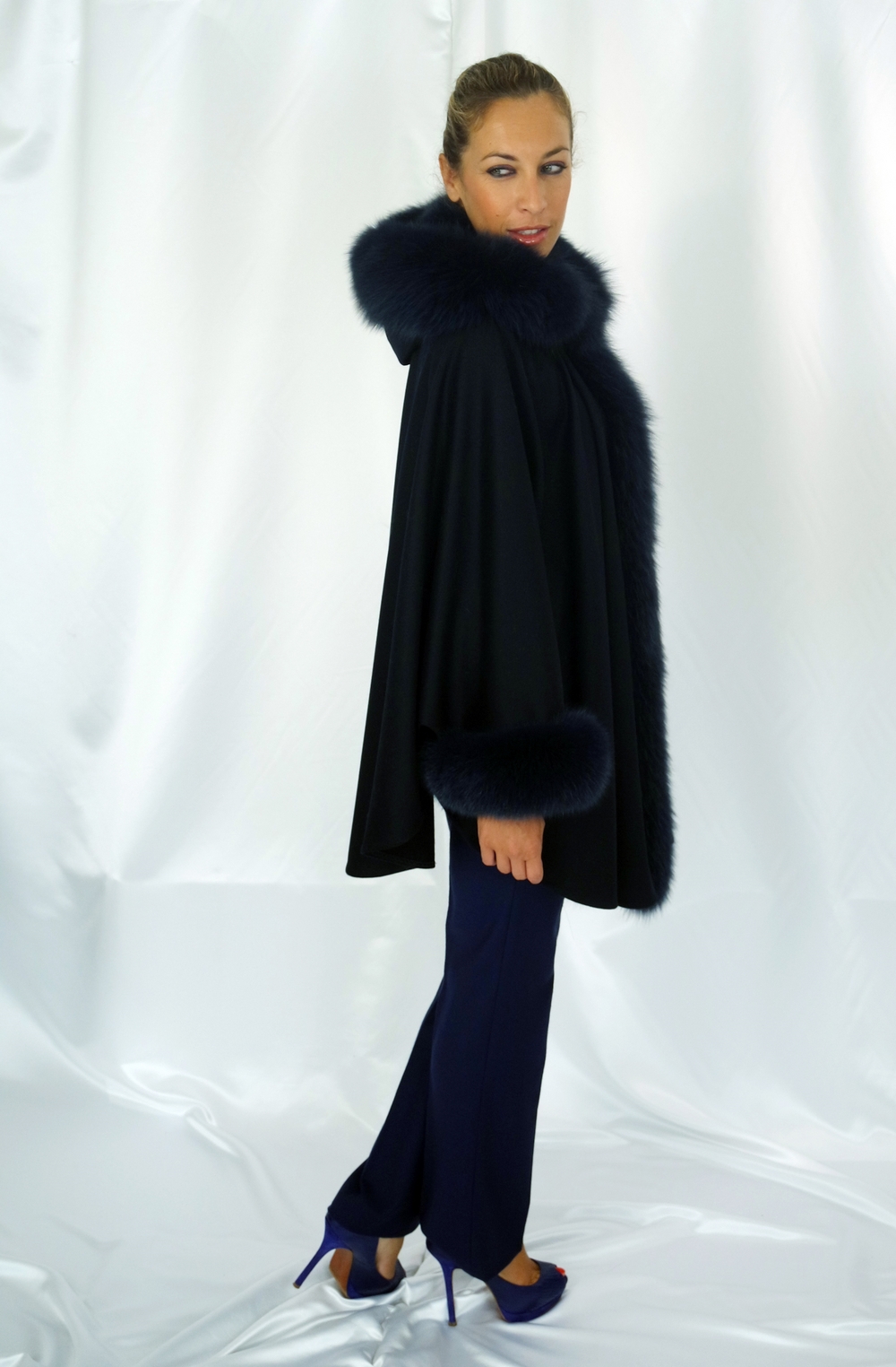 Cape blue in cachemire with fox border on hood, collar and cuffs