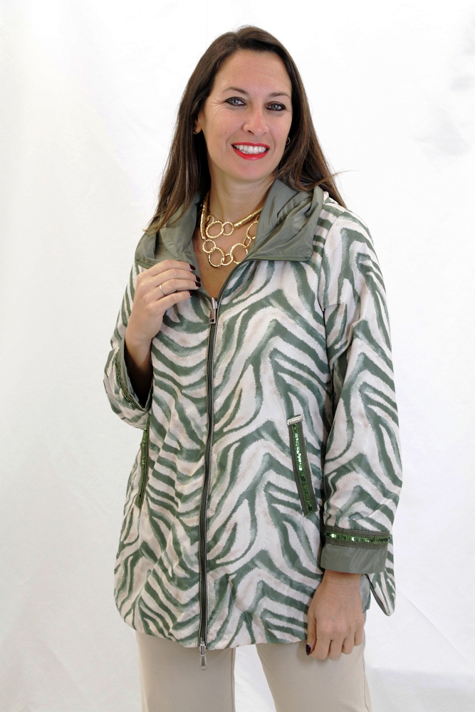 Reversible blouson jacket with a green and cream zebra pattern and green interior