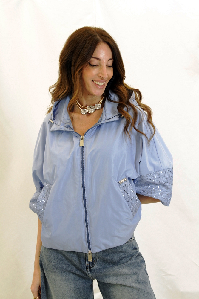 Light blue bomber jacket with detachable hood