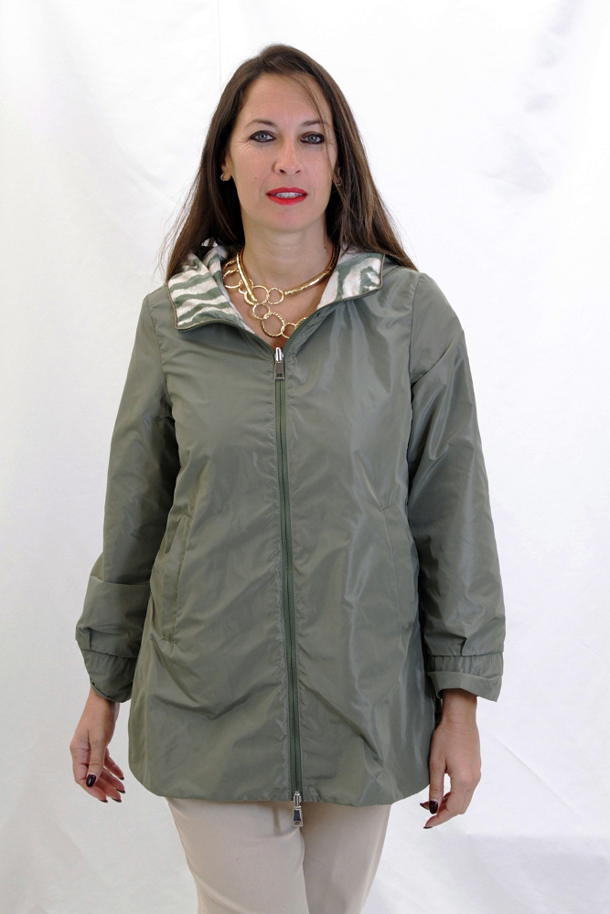 Reversible blouson jacket with a green and cream zebra pattern and green interior